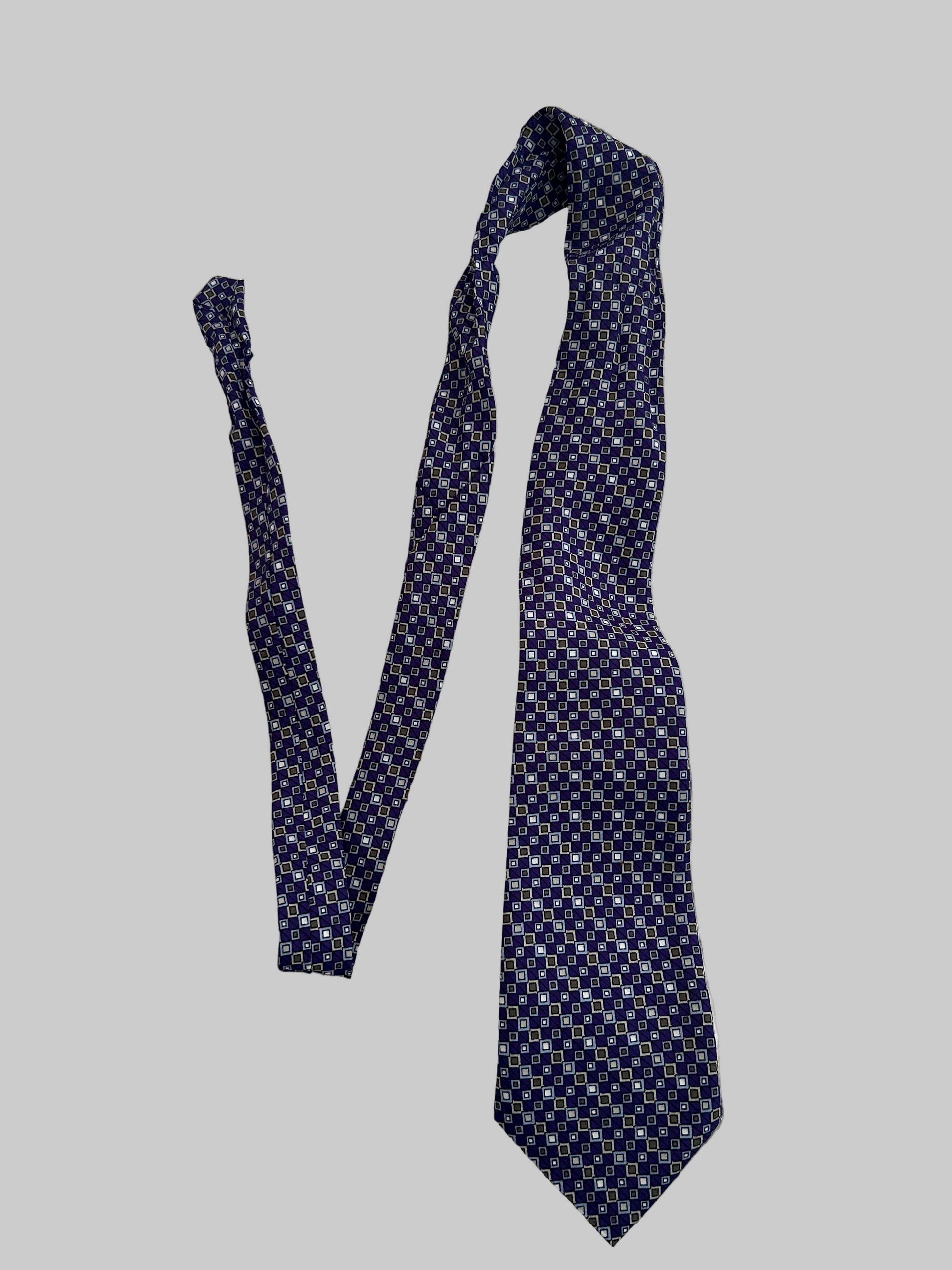 Das feine geometrische Muster in Blau-, Grau- und Weißtönen verleiht ihr einen eleganten Retro-Charme – perfekt für Business-Looks, festliche Outfits oder als Sammlerstück für Liebhaber klassischer Herrenmode.
